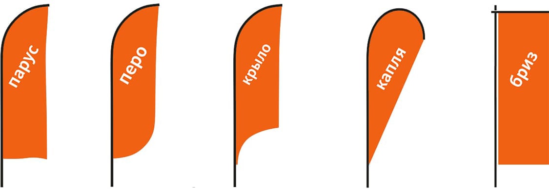 Флаги виндеры изготавливаются в шести различных формах: парус, крыло, перо, виндер (стандарт). Для этих моделей применим флагшток "Парус", имеющий загнутый вверх. Также есть формы виндеров с полукруглым верхом - "Капля" и традиционный прямоугольный "Бриз".